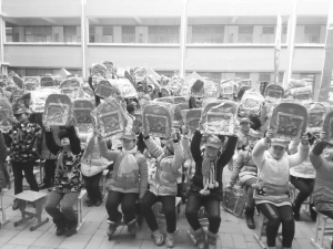 1月15日,周口义工协会工作人员与爱心商家江苏宗申有限公司厂方代表一同走进周口经济开发区实验学校,为这里的273名小学生(大部分是留守儿童)送去新书包。其中,6名品学兼优、家庭贫困的学生除领到新书包外,还领到了爱心商家捐助的米和油。图为学生们展示领到的新书包。晚报记者 张燕 摄