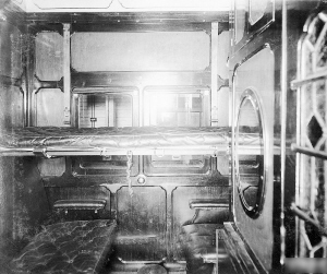 民国时期不流行预订车票(头等车厢和卧铺车厢可以预订,但是预订时效最长不超过两天),一般都是在火车即将进站的时候才开始卖票,在火车开前两分钟马上又停止售票。图为头等卧车内部。