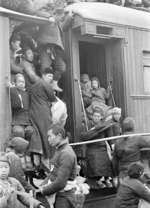 在当时的人们心中,头等车和二等车属于高等车厢,三等车属于普通车厢,四等车属于低等车厢,而争抢座位的现象主要是在普通车厢和低等车厢里发生,如果乘坐头等车、二等车和睡车(车尾加挂的卧铺车厢),那是没必要抢座的。图为普通民众乘坐火车的场景。