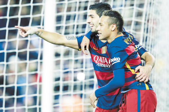 西甲联赛 巴萨胜毕尔巴鄂 当地时间1月17日,巴塞罗那队球员苏亚雷斯(左)在进球后与队友内马尔庆祝。当日,在2015/16赛季西班牙足球甲级联赛第20轮比赛中,巴塞罗那队主场以6∶0战胜毕尔巴鄂竞技队。新华社发