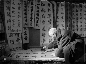 我父亲上过四年私塾,文笔还不错,特别是他那一手毛笔字,至今还让我景慕。早些年一到腊月二十几,拿着红纸让我父亲写春联的乡亲一拨又一拨,我家里地上铺的,墙上挂的,都是春联。我父亲端坐椅子上,一笔一画地写,真是点点如桃,撇撇如刀,端正有力,正像漫画里的意境。大半个村子甚至还有外村都挂着我父亲写的春联。可以说,父亲“笔挥半村春”。那时我已上小学,看得懂联里的内容,记得最清的有两副:世上四时春作首,人间五福寿为先;福禄寿三星共照,天地人一体同春。横批大都为八仙献寿、吉星高照之类。还有其他小联,像青龙治水、出门见喜、满院春光、六畜兴旺、五谷丰登之类,分别贴在水缸上、门口、院内、牛羊圈等地方。我上初中时,父亲就让我学写春联,一到春节,我可以为父亲分担劳累。年年来我家求书者仍是络绎不绝,我们是有求必应,就是晚吃会儿饭,晚睡会儿觉,也要让乡亲满意而归,有的带的纸不够,我们就用家里备用的纸,不能让他们耽误贴对联的好时辰。一次我发现一户人家门上光贴红纸而没写字,一问,是不想找人麻烦,我拿起笔给补上字,他很感动,我说下一年你只要不嫌弃,就上我家写。“文革”中写春联要突出政治,我写的最多的是:大海航行靠舵手,万物生长靠太阳;毛主席开创千秋业,红太阳照耀万年松。还写一些毛主席诗词:天若有情天亦老,人间正道是沧桑。横批就是抓革命促生产、破四旧立四新等。