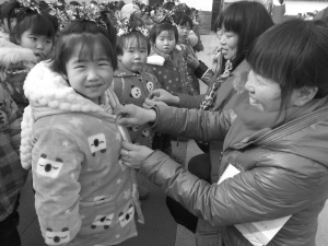 春节临近,商水县教育、妇联、计生等部门党员干部和社会各界爱心人士以多种形式看望慰问留守儿童,为他们送去社会的关爱。图为爱心人士为留守儿童穿新衣。