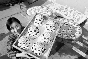 1月18日,在山东省聊城市阳谷县狮子楼街道北关村,村民王菲在展示蒸熟的的花糕。