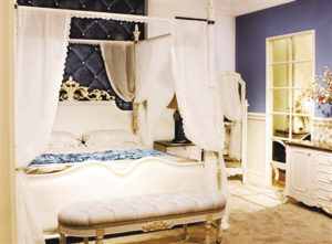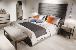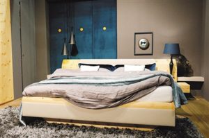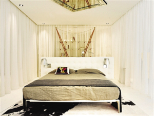 白色墙面搭配浅色地板,整个空间似乎融为一体。柔软的布艺床是空间中唯一温暖的地方,高高的舒适的靠背,吸引人来尝试床的舒服。白色和灰色的床品与空间很协调,橘黄色的靠垫成为亮眼的点缀。(付娟)