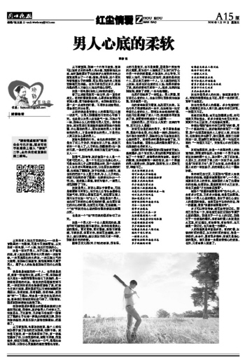 从前的我总是觉得女人的温柔可以化解一切戾气,让男人那颗燥动不安的心平静下来。也总是认为男人应该豪气一些,不拘小节一些,那些小女儿的情致与男人无关。但年龄渐长,却发现自己竟然越来越欣赏那些外表坚强、内心柔软的男人,因为这样的男人才是真性情的男人,才是活得明白的男人,才是把女人真正放在心里的男人。
