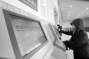 ▲一位旅客在自动取票机前取票