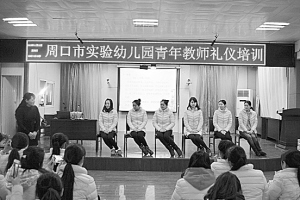1月21日,周口市实验幼儿园对青年教职工进行了礼仪培训。培训内容围绕着教师礼仪文化、教师个人礼仪、行为规范、课堂礼仪和幼儿一日生活礼仪等知识进行了详细讲解,还分别对教师的个人形象、站姿、坐姿、走姿和教师的微笑、手势动作逐一进行了学习。深入浅出地讲解、诙谐的语言风格赢得了现场阵阵掌声。牛锦华 摄