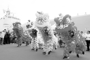 1月24日,在印度尼西亚雅加达港口,华侨华人表演舞狮欢迎中国海军舰艇编队来访。