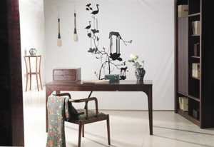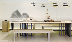 开放式的空间可以作为大餐厅、书房甚至家庭聚会场所,空间可以根据主人的要求随意变换功能。背景墙上写意的画面让人如入画卷中,简致的家具和灯具,让空间更有韵味,在大条案上泼墨挥毫,颇具气势。