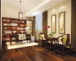 一个空间比较大的书房,也可以作为休闲空间使用。淡黄色壁纸给人很稳重的感觉,满墙的大书架可以摆放所有的藏书,中式家具为书房增添风雅情趣,而挨墙摆放的圈椅和小方几可以接待亲朋好友,在这里品茗赏画。