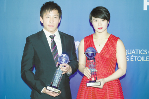 当地时间1月31日,何超、施廷懋(右)手捧奖杯合影。当日,国际泳联年度颁奖仪式在匈牙利首都布达佩斯举行,中国选手何超、施廷懋分别获得2015“年度最佳男子跳水运动员”、“年度最佳女子跳水运动员”奖。新华社发