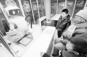 2月1日,参观者在南通科技馆体验机器人“科娃绘画”画像。