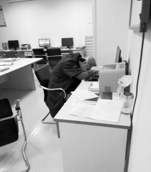 谁知刘霄还没走出手术室,又有两位急性脑出血病人要做手术。为使手术顺利进行,刘霄向科室主任汇报了有关情况。考虑到刘霄体力透支,科室主任派了一名医生前来协助他做手术。刘霄忍着疲劳,一丝不苟地把两台手术顺利做完。一切停当后,已是次日凌晨5时许。刘霄心想,天快亮了,一会儿还要交接班,反正是休息不成了,索性把术后记录完成吧!可刘霄的两只眼睛根本不听使唤,他不知不觉地趴在办公桌上睡着了(如图)。