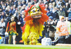 当地时间2月6日,演员在英超比赛中场休息时进行舞狮表演,庆祝中国农历新年的到来。当日,在2015~2016赛季英超联赛第25轮比赛中,曼城队主场以1∶3不敌莱斯特城队。新华社发
