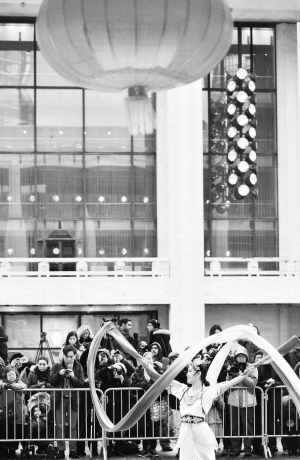 2月9日,一名舞蹈艺人在美国纽约林肯中心广场为市民表演彩带舞。