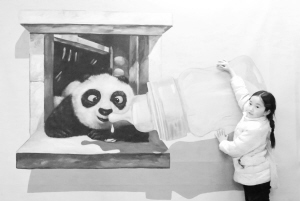 ▲2月13日,一名小朋友和展出的3D画作品互动合影。