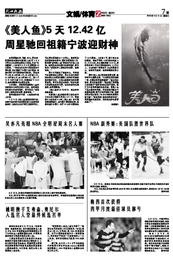 由周星驰执导,邓超、林允、罗志祥、张雨绮等主演的电影《美人鱼》于2月8日零点正式登录全国各大院线,引发“五洲震荡”。上映首日(2月8日)即取得2.8亿票房,一举成为内地首日票房最高华语电影,并且刷新了华语片单日票房、香港华语片首日票房等多项纪录。更先后于上映36小时破4亿,48小时破6亿,72小时破8亿,86小时破9亿,到2月12日18时已破12亿,并最终拿下12.42亿,继续刷新着内地影史纪录。