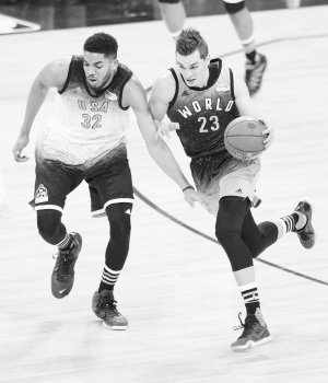 2月12日,美国队中来自明尼苏达森林狼队的唐斯在比赛中防守世界队中来自克罗地亚球员马里奥·赫祖加。