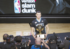当地时间2月13日,森林狼队球员扎克·拉文手握奖杯留影。当日,2016年NBA全明星周末扣篮大赛在加拿大多伦多举行,森林狼队球员扎克·拉文在扣篮大赛决赛中战胜魔术队球员阿隆·戈登,成功卫冕。