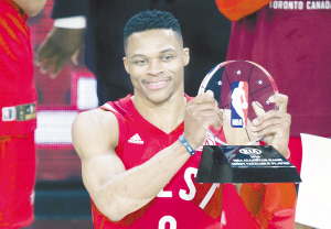 当地时间2月14日,西部明星队球员“威少”威斯布鲁克在赛后手捧全明星赛MVP(最有价值球员)奖杯庆祝。当日,在加拿大多伦多举行的2016年NBA全明星赛中,西部明星队以196∶173战胜东部明星队。