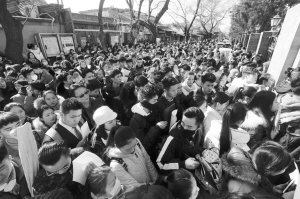 2月15日,在中央戏剧学院东校区门前,众多考生排队准备进场考试。