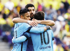当地时间2月20日,巴塞罗那队球员内马尔(左)进球后与队友苏亚雷斯(中)和梅西庆祝。当日,在2015~2016赛季西班牙足球甲级联赛第25轮比赛中,巴塞罗那队客场以2∶1战胜拉斯帕尔马斯。