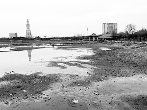 当日,周口晚报记者在周口公园看到,园中央颇具特色的景观湖水位下降严重,很多地方已经干涸,湖底露出淤泥,湖岸原先没入水中用于支撑栈桥的桥墩及深埋湖下的雨水管道统统裸露在外,湖面失去以往碧波荡漾、波光粼粼的景象。一些顽皮的孩子跳入干涸的湖底,拿着木棍在淤泥中翻来找去,不一会儿,就挖出一堆拳头大的河蚌,兴高采烈地拿回家去了。在公园散步的杨先生告诉周口晚报记者,由于家住附近,他经常到公园散步,景观湖的湖水一直很充沛,之前从未干涸过。