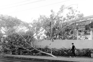2月22日,在斐济首都苏瓦,一名男子从被风吹折的树枝前走过。