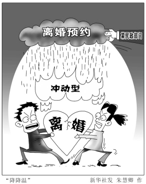 记者了解到,为减少冲动离婚带来的社会之痛,我国多个地方都在尝试积极的“干预”举措。北京、上海等地婚姻登记部门设立离婚调解室或离婚劝和工作室,还有广州、甘肃等地一些城市也推行了离婚预约登记制度。