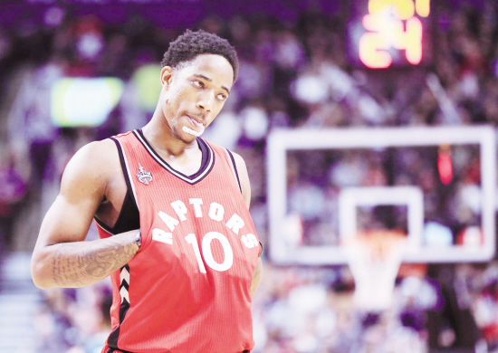 NBA常规赛 猛龙胜森林狼 当地时间2月24日,猛龙队球员德罗赞在比赛中。当日,在2015~2016赛季NBA常规赛中,多伦多猛龙队主场以114∶105战胜明尼苏达森林狼队。新华社发