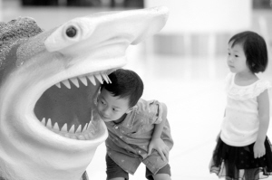 2月28日,在马来西亚沙巴州首府哥打基纳巴卢,参与活动的儿童在鲨鱼模型旁玩耍。