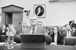 3月1日,在美国华盛顿国会山,苹果公司高级副总裁兼总法律顾问布鲁斯·休厄尔(前)出席听证会。