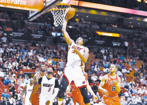 当地时间3月1日,热火队球员怀特塞德(中)在比赛中扣篮。当日,在2015~2016赛季NBA常规赛中,迈阿密热火队主场以129∶111战胜芝加哥公牛队。