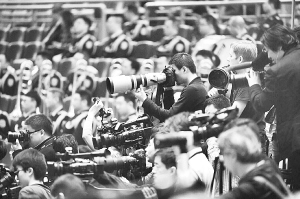 3月3日,中国人民政治协商会议第十二届全国委员会第四次会议在北京人民大会堂开幕。这是媒体记者在会场采访拍摄。