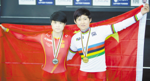 当地时间3月6日,分获冠军、亚军的中国选手钟天使(右)、林俊红在颁奖仪式上身披国旗庆祝。当日,在英国伦敦举行的2016场地自行车世锦赛女子竞速赛决赛中,中国选手钟天使、林俊红分获冠亚军。新华社发