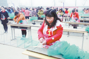 当日上午,简短仪式过后,随着裁判一声号令,参赛选手们飞针引线、织梭飞舞(如图),个个精神饱满、神采飞扬,裁判们认真计时,观众们加油助威,比赛场面热烈沸腾。根据比赛规则,主项目渔网编织经过两轮50多分钟角逐,子项目穿网须经过两轮拼杀后,进入广场舞展示和决赛阶段。经过评委评定,各类获奖选手脱颖而出。