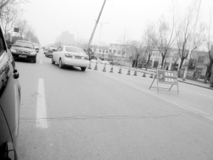 3月7日,周口晚报记者在交通大道(大庆路至周口大道段)看到,该路段南半幅封闭,北半幅道路双向通行。据施工人员介绍,此举是为了修整南干渠护栏,请过往车辆尽量绕行。