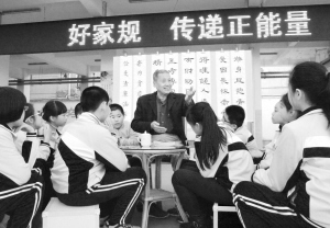 荣获全国“百名传承好家风的好妈好爸”称号的郭景国(中)在正用《百家家训》一书向小学生讲解莆田传统好家规家训(3月4日摄)。