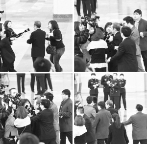 3月9日,十二届全国人大四次会议在北京人民大会堂举行第二次全体会议。这是会前,国务院港澳事务办公室主任王光亚接受媒体记者采访(拼版照片)。新华社发