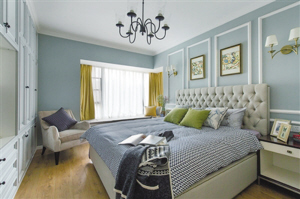 休息空间中,设计师利用背景墙上四个框格的简约线条,保留了美式特有的美感,除此之外,壁灯和主灯也采用了传统美式灯具。蓝灰色基调加上室内窗户设计,无处不彰显着恬静浪漫的情结。睡床对面的收纳柜选择纯白色材质,与进门处的收纳柜为同一系列。柔软的黄色窗帘温暖平和,让人感觉到安静温暖的气息。(董波)
