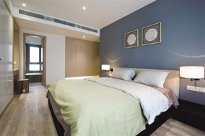 卧室中,明亮轻松的原木色与白色依然从客厅延伸至卧室,蓝灰色的背景墙只有两幅简单的装饰画,床头灯也使用了简洁款。床对面的嵌入式壁柜,有足够大的储藏空间,可以保持卧室里的干净整洁。靠门处做出一个小小的吧台,可以作为梳妆台使用,也可以当做临时的工作台,方便灵活。