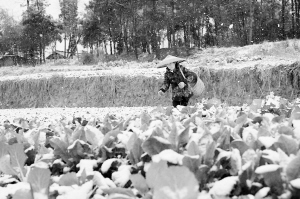3月10日,湖南省邵阳市隆回县三阁司镇一名农民冒雪在菜地里采收蔬菜。