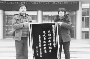 本报讯 “太谢谢您了,我当时被压在电动三轮车下,如果不是您和同事出手相助,后果不堪设想。”3月10日,太康县王集乡的梁玉玲在家人的陪同下,来到该县县供电公司,感谢恩人王建设,并将一面写有“危难时刻伸援手 见义勇为品格高”字样的锦旗送到他的手中(如图)。