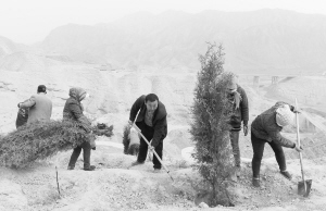 3月12日,甘肃临夏回族自治州永靖县居民在黄河岸边植树。