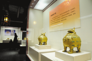 3月13日,观众从沈阳故宫博物院展出的“清铜镀金甪端”展品旁走过。