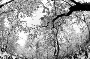 3月14日,游人在昆明圆通山公园内观赏盛开的樱花。