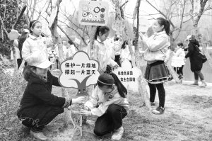 3月17日,小学生与志愿者一起将护绿主题提示牌树立在园林中。