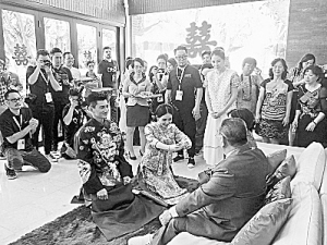 19日晚,众明星已经先于度假村举行了热闹的欢迎party,《步步惊心》群星合影,包括“皇阿玛”刘松仁。吴奇隆、刘诗诗正是因这部戏相识而陷入热恋。两人于2015年1月对外公布“领证”。本月,终于在外界的注目下成婚。(京晚)