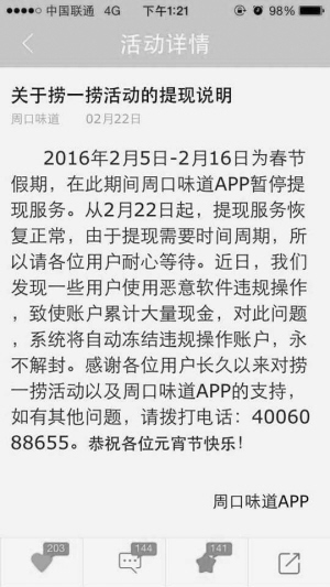 周口晚报记者就此事拨打了“周口味道”APP客服电话,客服工作人员解释说,目前他们正在统计“捞一捞”活动的相关数据,等待活动所需的款项到位,希望无法提现的用户耐心等待。