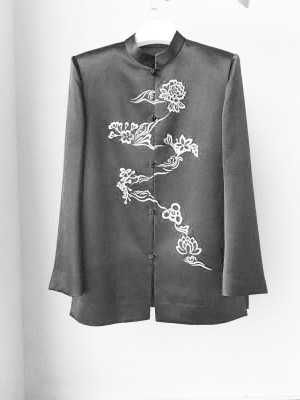 虽然以与会各国的国花来体现这次会议的主题是一个很新颖的创意,但为了体现出这些花的实体形态和立体美感,马艳丽和她的团队经过深思熟虑,决定采用中国画笔触国花写意绣的方式,用金线刺绣的手法把6种不同的国花绣在礼服上。使用金线轮廓绣的方式绣制纹样,摆脱了图案印刷的单一感,能带来更为灵动的气息,同时也能凸显我国历史悠久的刺绣技艺。